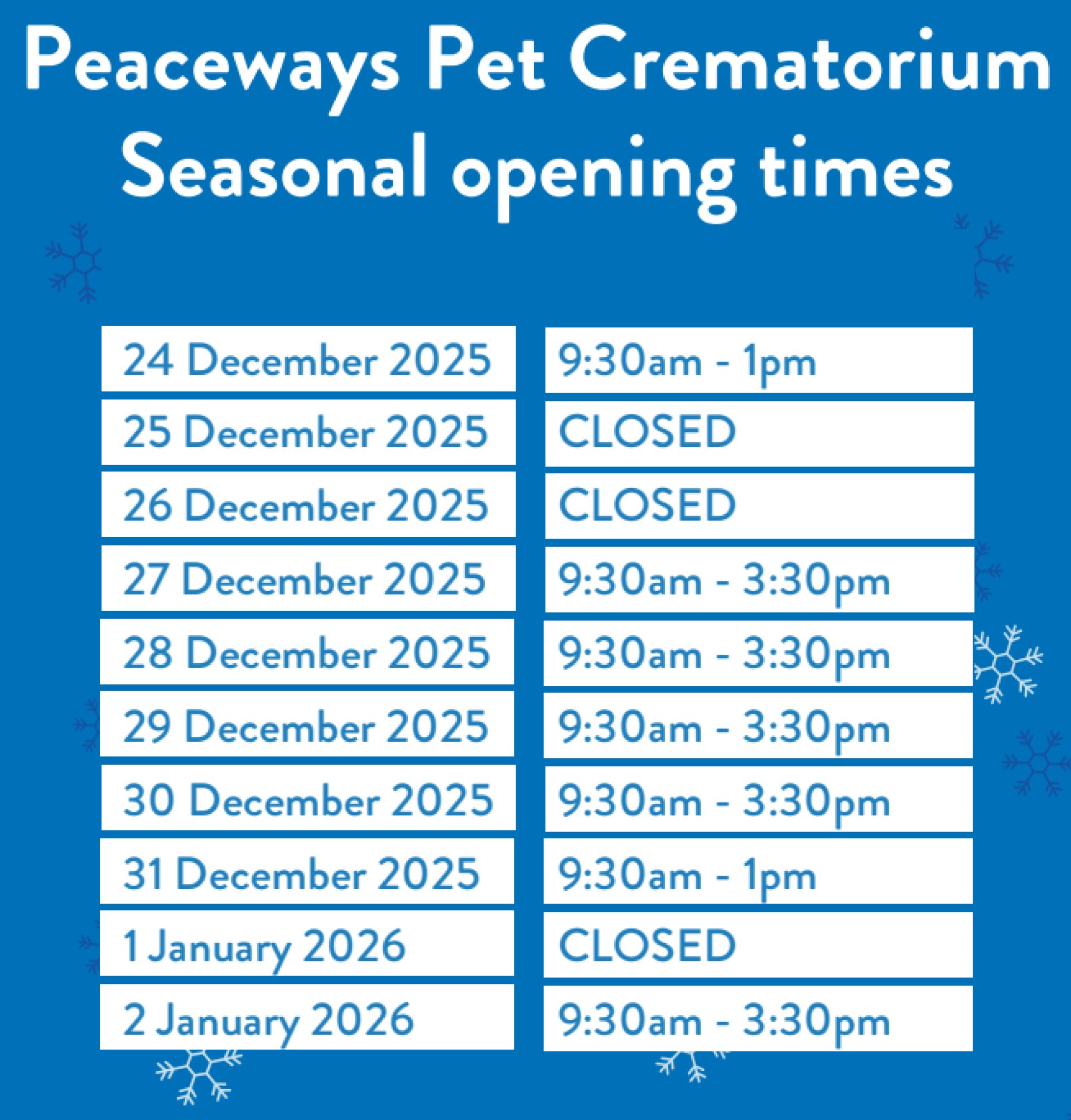 There is a choice of private cremation – your pet’s ashes will be ready for collection after a few days. Alternatively, we offer a communal cremation where the ashes are scattered in the grounds at Peaceways.